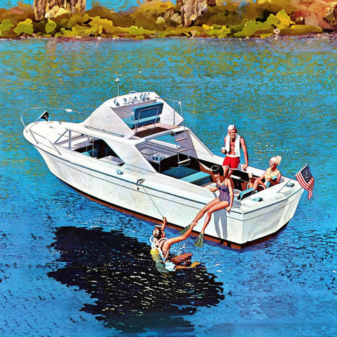 Hull came a number of ways. An open boat, soft top, hardtop, or with a Command Bridge. Single 185 or 210hp or or twin 185’s. Top speed 38mph.
